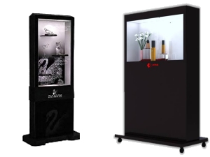 Las cajas escaparate iluminadas transparentes vienen en 22 y 46 pulgadas, en una vitrina cerrada con una superficie de vidrio transparente en su frontal que puede mostrar el contenido multimedia delante de los productos colocados en el interior de la unidad.